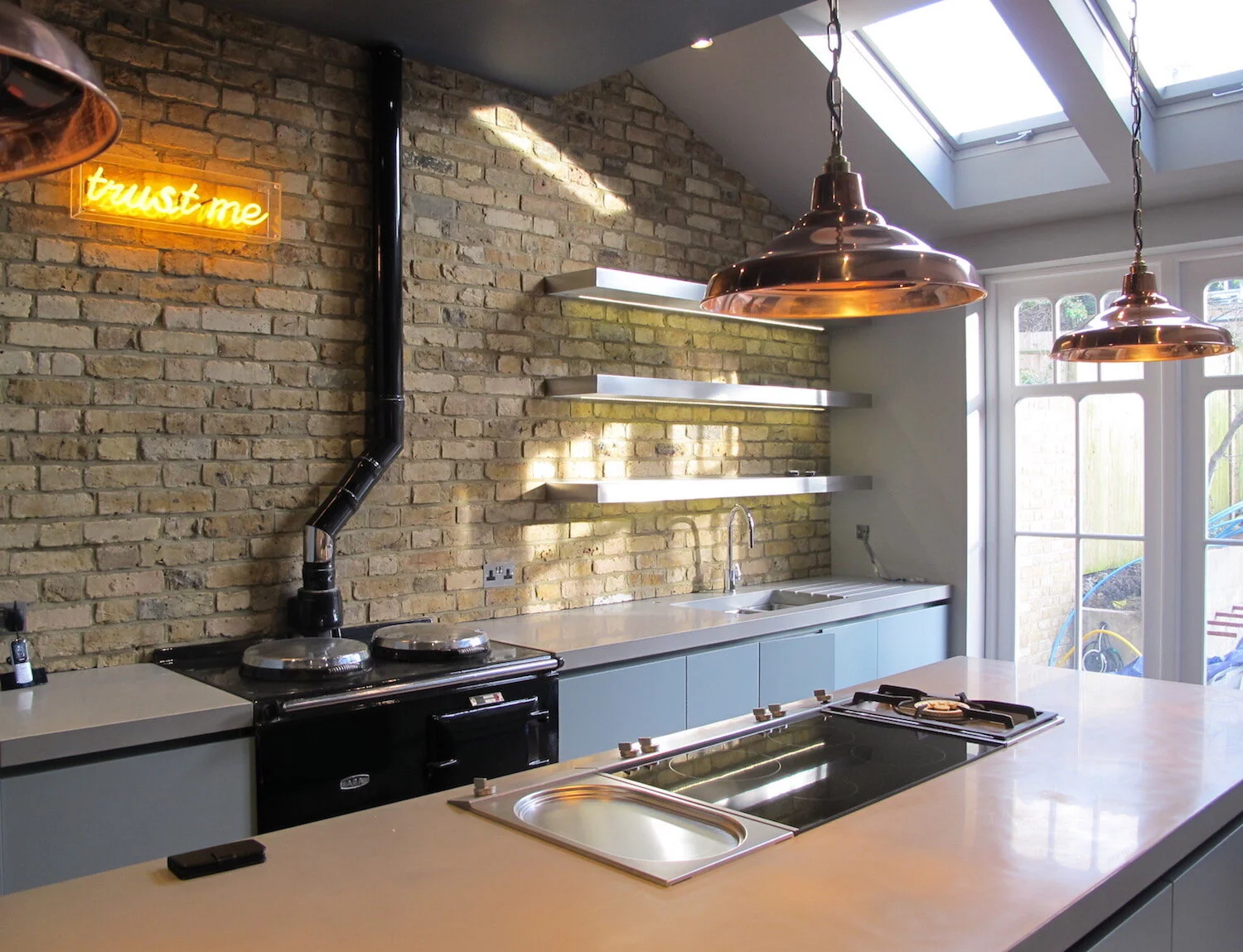 A striking bespoke kitchen with coloured doors and a folded polished concrete worktop provides a visual and social centre to the open plan ground floor space. Two new dormer windows and a timber stair provide space for a new bedroom and en-suite within the roof space.