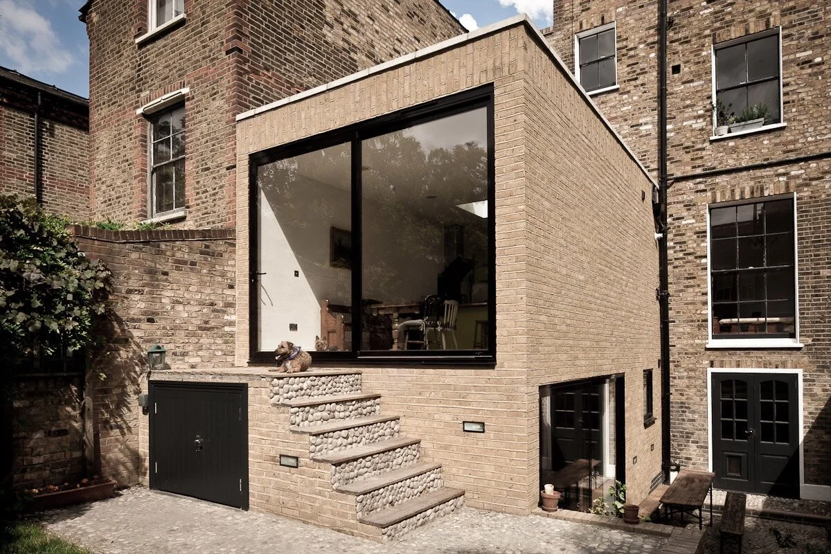 The two storey extension is clad in London Stock bricks to match the existing building and punctuated with full height and width openings on both floors, which break down the mass, flood the spaces behind with light and make an immediate connection to the garden and adjacent sunken courtyard.