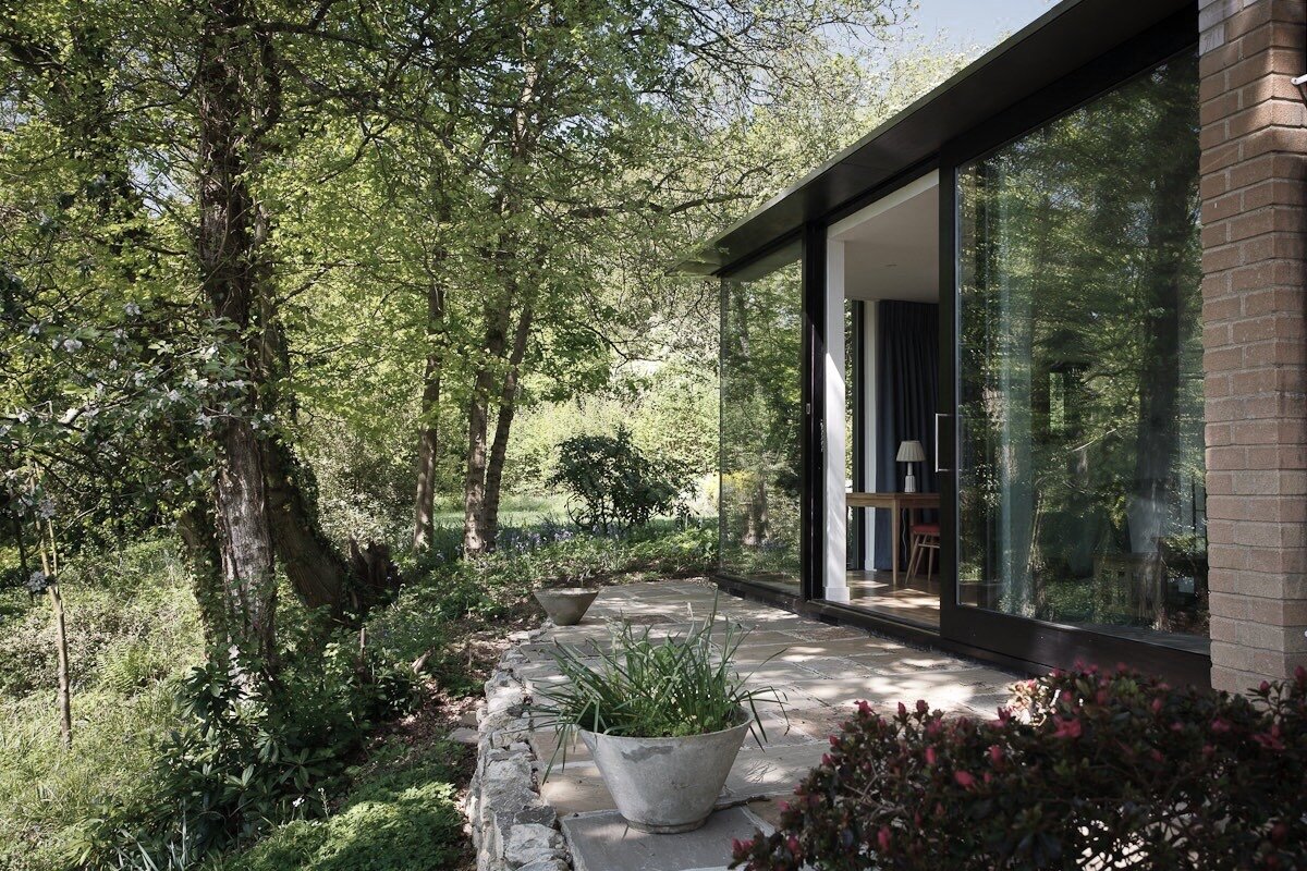 The studio is an elegant timber framed structure, clad in stained boards that is strategically glazed to provide separation from the main house. Inside, views of the pond fill the full height glazing that wraps around the rear elevation enlivening the interior space, and a large sliding door provides access onto an extended terrace contained by a wall of reclaimed Kent ragstone.