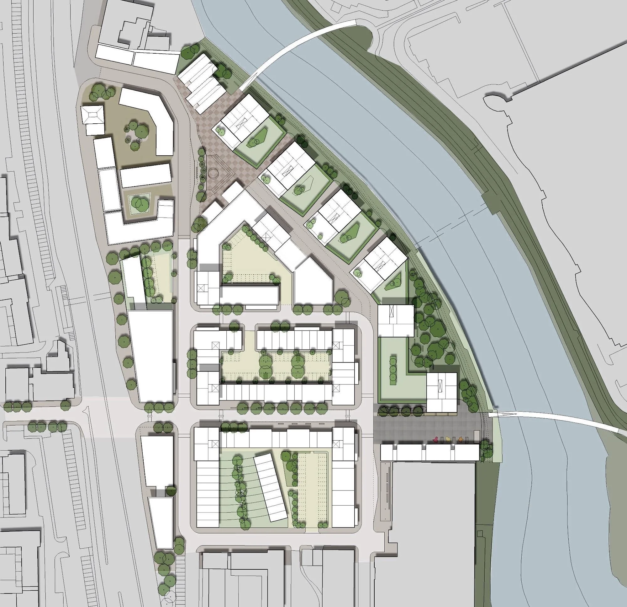 Central to the development of the plan is a sense of permeability, which is achieved through active civic spaces that set up positive connections with the riverside. All the dwellings are given easy access to public and private amenity, and the shopping streets are animated and wide.